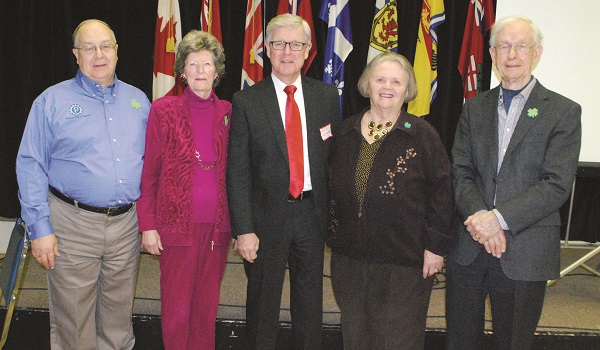 CLASS PHOTO – The PROBUS Club of Aurora celebrated its 20th anniversary at the Royal Canadian Legion on Wednesday morning. Mayor Geoff Dawe, centre, was one of two keynote speakers at the event, which attracted a number past Citizens of the Year, as well as the incumbent. From left: Lowell McClenny, current Citizen of the Year Beverley Wood, Mayor Dawe, Jo-anne Spitzer and Dr. Leslie Oliver. Bud Gilbert also attended the meeting. Auroran photo by Brock Weir