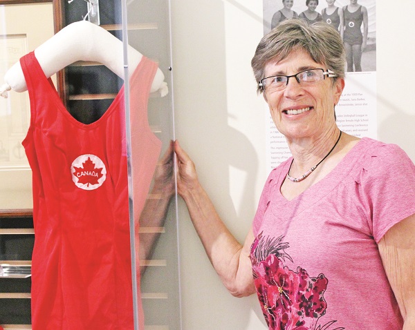 And, shielded by a glass case, hangs the bathing suit of long-time resident Janice Jones (nee Shepp), which she wore to win a silver medal in the 1959 Pan Am Games in Chicago – a polyester suit complete with a “modesty panel” in the front.
