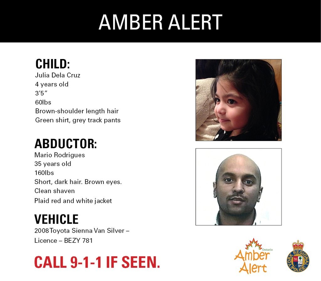 BREAKING: Amber Alert cancelled after child found in Pembroke![]() York Regional Police have cancelled an Amber alert issued Monday morning after locating four-year-old Julia Dela Cruz in Pembroke, ON. Police say they located the Aurora girl and arrested her father, Mario Rodrigues, 35, following a collision in Renfrew County. Rodrigues has been taken to hospital. EARLIER: York Regional Police have issued an Amber Alert for four-year-old Julia Dela Cruz who Police say was abducted by her father, Mario Rodrigues, 35, early Monday morning. The vehicle, a 2008 silver Toyota Sienna van with a license plate BEZY 781, was last seen travelling south in Aurora. Julia is described as 3'5”, 60 lbs, with brown shoulder-length hair, and is wearing a green shirt and green track pants. Mario is described clean shaven with short, dark hair, brown eyes, and 160 pounds. He is wearing a red and white plaid jacket. If seen, call 911 immediately. |