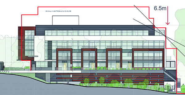 Since it was first proposed, the proponent has worked with the Aurora Historical Society, owners of Hillary House, the OHT, Aurora’s Design Review Panel and area stakeholders to make sure the plan is more in keeping with the neighbourhood. Changes include a reduction of the building by one storey, the elimination of rooftop features to reduce shadowing and massing on the surrounding neighbourhood, and changes in building materials to make it more “sympathetic” to the community.