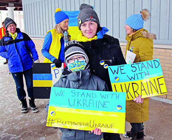 But despite raising nearly $4,500 for the Red Cross through the sale of buttons emblazoned with the Ukrainian flag, he still felt it was not enough, so he and his mother, Suzanne Cummings, put on their winter gear on Sunday afternoon and joined dozens of area residents at the Aurora Cenotaph for a march and rally in support of Ukraine.