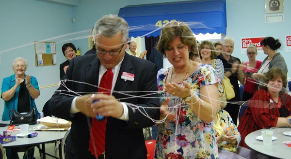 (Chris and Audrey Ballard are celebrated with a blast of silly string and confetti at the Newmarket Legion on Thursday night. Auroran photo by Brock Weir)