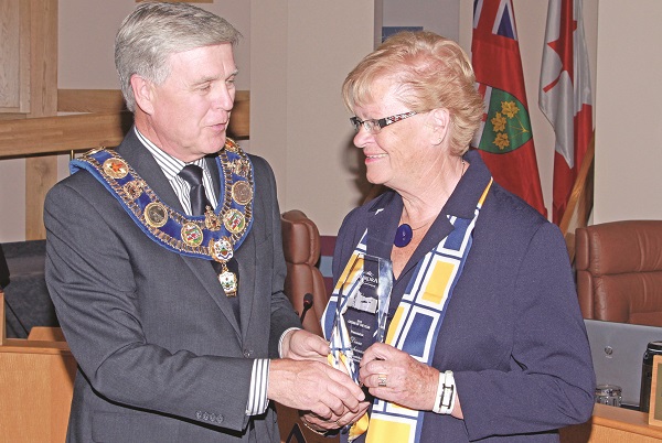 After an ovation from the audience, with her children and grandchildren providing some of the loudest cheers, Ms. Buchanan was front and centre in the Council chamber to receive her award – and a significantly-sized bouquet of flowers – from Mayor and Council. As it turned out, Mayor Dawe noted, following their phone conversation last month, Ms. Buchanan told him he had cut her short. Neither party were going to let that happen again, as the newly minted Citizen of the Year took the podium.