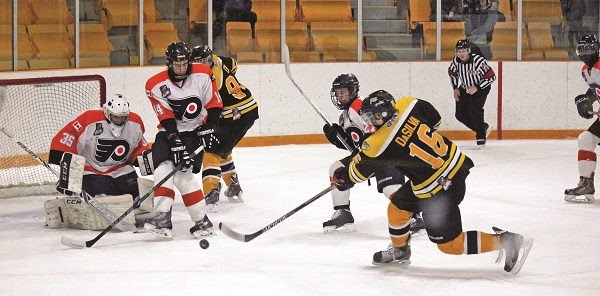 As the penalty expired, three Orangeville sticks in front of Andy Munroe’s net were able to force the puck in for a 2 – 0 Flyers lead after one period.