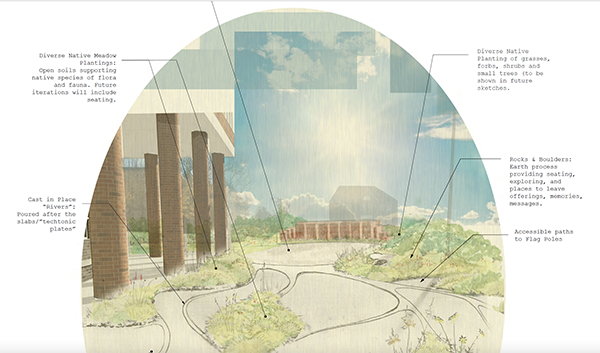 “[The design] proposal introduces key elements that support the space’s mandate, including thoughtfully secluded layout within the Town Hall footprint, accessible pathways, and elements that encourage quiet reflection. The proposed design fosters a respectful environment that accommodates diverse expressions of grief, while maintaining a clear distinction from spaces typically associated with protest or political activity.