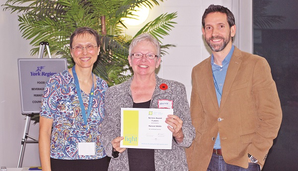 Ms. Webb, a long-time volunteer of the Canadian Cancer Society, was recently honoured for her many years of service with the group at a special ceremony for volunteers participating in a myriad of the society’s programs, at the offices of the Regional Municipality of York.