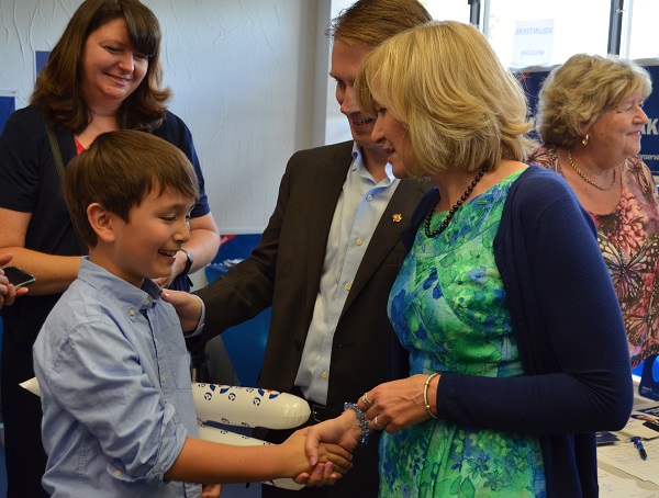 Laureen Harper, wife of Conservative leader Stephen Harper, meets a young supporter during a whistle-stop visit of Aurora-Oak Ridges-Richmond Hill on Wednesday afternoon, during the first week of an 11-week Federal election campaign. Auroran photo by Brock Weir