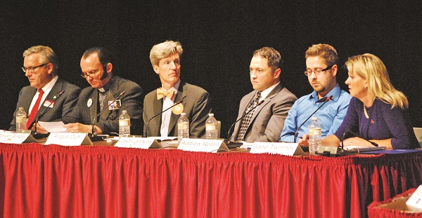 After recording a further debate earlier in the day, they arrived at Newmarket Theatre primed and ready to go. Ready to do battle in the political theatre were Liberal candidate Chris Ballard, Canadians’ Choice candidate Dorian Baxter, NDP candidate Angus Duff, Libertarian candidate Jason Jenkins, Green Party candidate Andrew Roblin, and Progressive Conservative candidate Jane Twinney.
