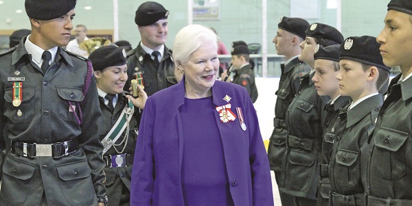 The salute was returned with a nod and a laugh by the delighted Elizabeth Dowdeswell, Lieutenant-Governor of Ontario, who paid her first visit to Aurora on Saturday morning, serving as reviewing officer for the 49th Annual Ceremonial Review Parade, which was held at the Stronach Aurora Recreation Complex (SARC).