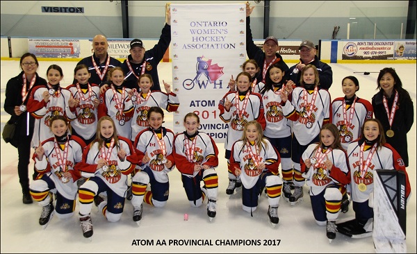 What an exciting season the Aurora Panthers Atom AA team had in 2016-2017. They won many golds, including the Waterloo Ravens Tournament in November 2016, followed by gold in the 2017 Silver Stick Tournament, gold in the Bolts & Hearts Tournament in Durham West, and finished off with gold in the Lower Lakes Female Hockey League Championships and then gold in the 2017 Provincial Championships. Truly a team of hard working girls who even received a congratulatory message from Hailey Wickenheiser herself!