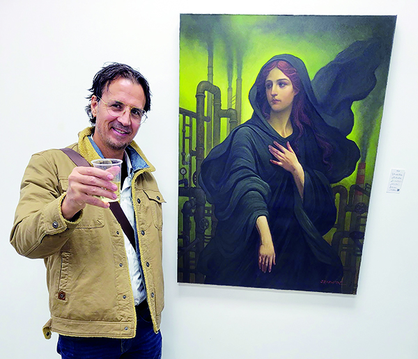 Jarring juxtapositions take place in Newton’s visual narrative: a dynamic female in the foreground could belong in any Da Vinci painting, but lurking in the background as a challenge to the hero’s well-being are smokestacks belching effluents—marring the character’s future. The centrepiece of the painting could, indeed, belong in a Renaissance gallery, but the background images are disturbingly modern. Newton seems to be celebrating human beauty bathed in radiant light, but it’s about to be inundated by the dark side of humanity represented by unbridled industrialism and its impact on climate change.
