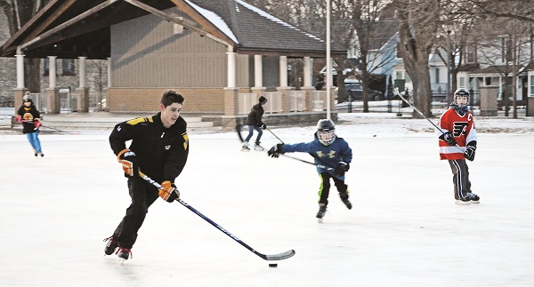 The outdoor skating rink at Town Park was enjoyed by hockey players and pleasure skaters on Monday night. The draft vision of the Cultural Precinct Plan calls for the rink to me moved to the south end of the park.