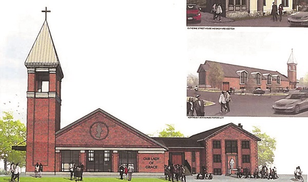 Plans for extensive refurbishment of Our Lady of Grace (OLG) Catholic Church include a dramatic overhaul of the Yonge Street frontage including tearing down the existing portico for a 171 square metre glass-enclosed narthex, a 10 square metre sanctuary at the east end of the church, a significant steeple on the northwest corner of the building, and a complete demolition of the adjacent Lynett Hall, which has been a gathering place for the Catholic community since the 1960s, to be replaced to with a 54 square metre addition onto the south side of the building.
