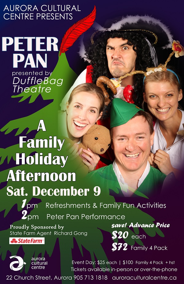 The Aurora Cultural Centre presents its annual Family Holiday Afternoon on Saturday, December 9 at 1 pm, featuring “the Nearly World- Famous DuffleBag Theatre” in an uproarious, family-friendly stage presentation of Peter Pan.”\