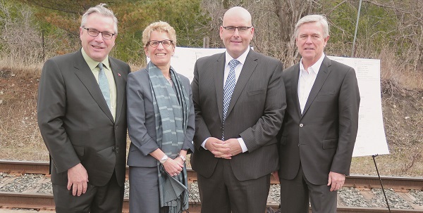 Premier Kathleen Wynne renewed the Province’s commitment to two-way all-day service to Aurora last week in Barrie, joined by Steven Del Duca, Minister of Transportation, Newmarket-Aurora MPP Chris Ballard, and Aurora Mayor Geoff Dawe.