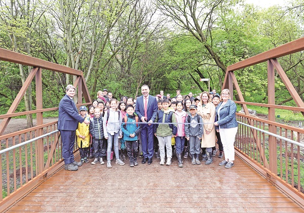 On Tuesday, Mayor Tom Mrakas was joined by members of the Lake Simcoe Conservation Authority and students from Aurora Grove Public School to help dedicate a new bridge along the tributary of the East Holland River that flows through the popular conservation area.