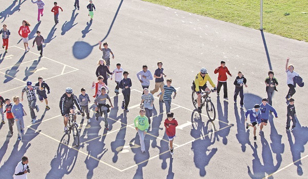 (Students and York Regional Police walk to Rick Hansen Public School last week. Land formerly slated for a nearby Catholic School is currently under discussion by Council with adjacent neighbours pushing for parks rather than additional homes. Auroran photo by Jeff Doner)