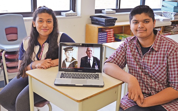 “Just being able to see his life in the Navy and moving forward from there was cool,” says student Sanjay Singh, who penned the words in the commemorative video. “He was very inspiring. He didn’t glorify his experience at all. He saw his friends actually die during the battles he encountered and it really made me think how much he had been through. We split the class into two groups, one who would make a thank you to Mr. Bedal for coming in and one to talk about Remembrance Day and what it means to them. I decided to do the side for Mr. Bedal because he was really inspiring to me. I just sat down at the computer writing away to see what came to mind and I realised some of the words that were coming out happened to be in correlation.”