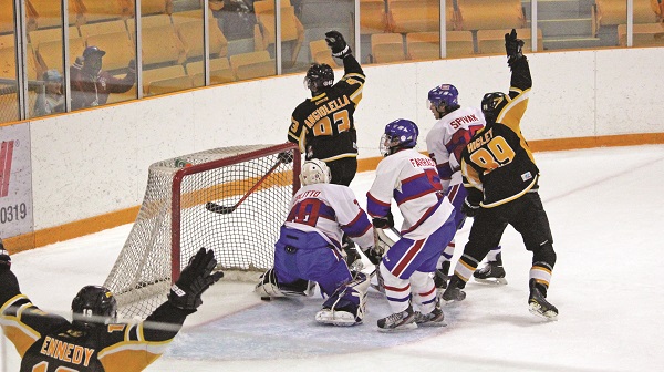 Captain Robert Angiolella evened things up three minutes later, netting a power play marker of his own.