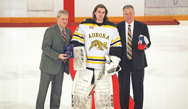Goaltender Andy Munroe has been the “backbone” of the Junior A Tigers club this season, according to head coach James Richmond. Here he is presented with the Gongshow Goaltender of the Month award for the second time this season, after posting a .952 save percentage in January.