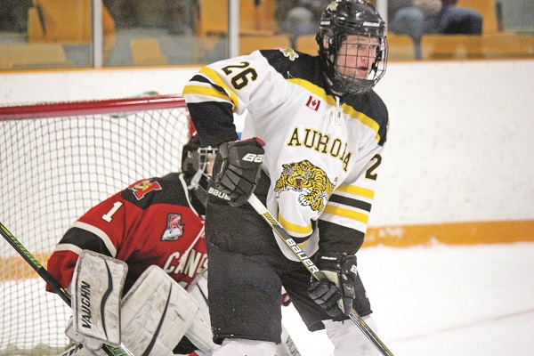 SILVER LINING – While the Aurora Tigers might still be smarting after their loss to Kingston last week, some welcome news came this Tuesday when Cameron Morrison, pictured above in a game against the Newmarket Hurricanes last month, was named Rookie of the Year by the Ontario Junior Hockey League. At 16, he is the youngest rookie to clinch the award since the 2007 – 2008 season. Auroran photo by Jake Courtepatte