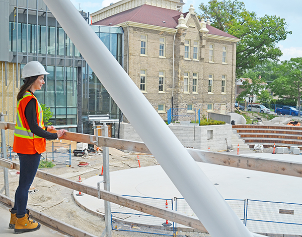 By last Thursday afternoon, each component of Town Square yet-to-be-complete was a hive of activity as construction workers worked inside on the completion of the new centrepiece staircase between the historic schoolhouse and its new addition, the new parking lot to the north of the site, the bridge, and the outdoor amenities: the skate loop, water wall and amphitheatre seating.