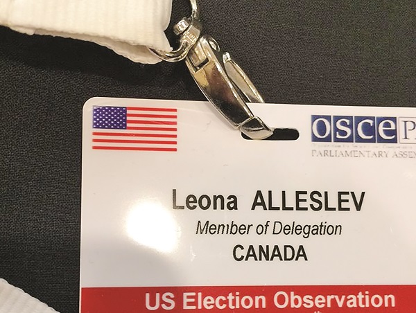Ms. Alleslev was in North Carolina in her role as a member of the Organization for Security and Cooperation in Europe’s Parliamentary Assembly. Teamed with Conservative MP Earl Dreeshen of Alberta, their mission, which included 130 delegates from over 30 nations, was to observe the U.S. election on many fronts, including whether President Elect Donald Trump’s pre-victory dismissal of a “rigged” election held water. (Their findings? It didn’t hold water)