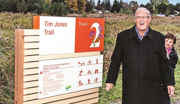“Today, Tim, we honour you for your love of the Town and your commitment to making Aurora a better place to live, work and play. For all your diligence, hard work and determination to enrich the many aspects of Aurora, on behalf of the Town of Aurora and Town Council, it is my extreme pleasure to dedicate this trail to former mayor Tim Jones and rename it the Tim Jones Trail.”