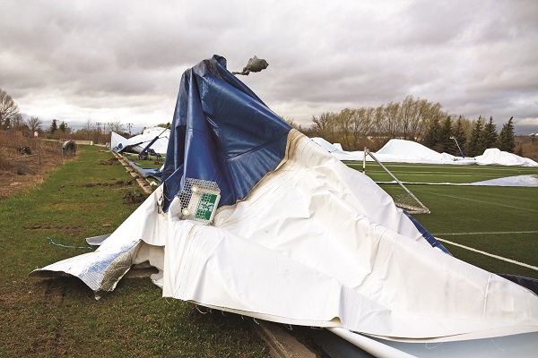 “We’re here with a crew that is mitigating the damage and they are picking up all the pieces they can because half our dome is sitting on the wrong field,” Terry told The Auroran on Tuesday. “There is considerable damage and there is a possibility we might have to put in a new dome. If that is the case, the good news is it is at a time of the year when we’re not too busy. The bad news is it will take months to get a new dome put up. It is just a question of doing what we can to make this whole place safer.”