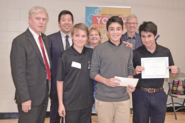 The Youth innovation Fair, hosted by the Town of Aurora and the Rotary Club to mark Canada 15, was held at the Aurora Leisure Complex, attracting dozens of student innovators from across Aurora – and even a few from beyond – who were able to pitch their impressive and practical innovations to judges Mayor Geoff Dawe, Citizen of the Year and entrepreneur Peter Van Schaik, Richard Gong of State Farm Insurance and Wendy Browne of the Aurora Rotary Club.